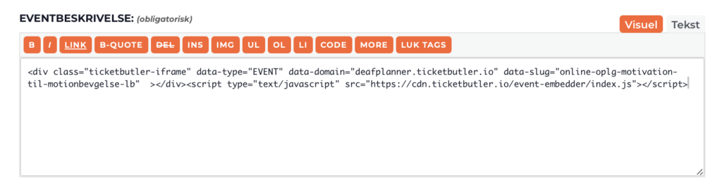 - Gå ned til “Eventbeskrivelse” og vælg fanen “Tekst”